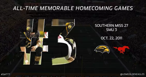 HATTIESBURG, Miss. -- The Southern Miss football team will host Marshall on Saturday at 6 p.m. for its annual HOMECOMING game. As that date approaches, we take a look back on the 10 most memorable HOMECOMING games in Golden Eagle history.