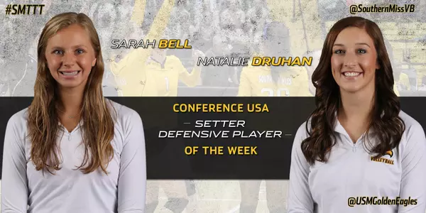 IRVING, Texas -- Southern Miss Volleyball's dominant ending to the regular season got even sweeter with the announcement that Sarah Bell and Natalie Druhan were named C-USA Setter and Defensive Players of the Week, respectively.