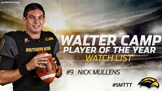 NEW HAVEN, Conn. -- The 2016 watch list season ended with a bang for Southern Miss, as senior quarterback Nick Mullens was named to the Walter Camp Player of the Year Award Watch List on Friday morning.