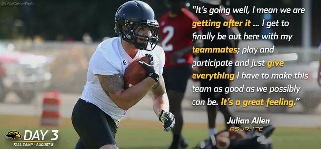 Report: Southern Miss transitioned into shoulder pads and shorts for its third practice of fall camp here Monday and also took advantage of an overcast sky which helped keep the normally hot summer temperatures in check during the 2 ½ hour workout. The Golden Eagles opened the day with special teams periods, and then continued to put in their schemes for the remainder of the practice that included individual and team periods.