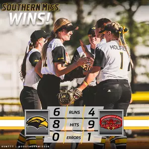 JACKSONVILLE, Ala. - The Southern Miss softball team completed the three-game series sweep over the Gamecocks of Jacksonville State, Sunday, with a 6-4 win.