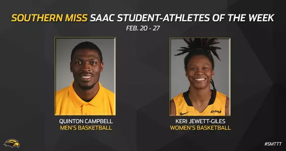 HATTIESBURG, Miss. -- Southern Miss basketball standouts Quinton Campbell and Keri Jewett-Giles have been named the SAAC Players of the Week, as voted by their peers.