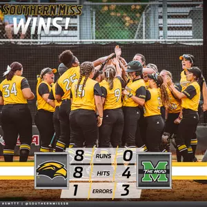 HATTIESBURG, Miss â€" Southern Miss softball split the day against the No. 30 Thundering Herd of Marshall, winning 8-0 in run-rule fashion to end the day and snap the visitors 17-game winning streak. The Golden Eagles move to 18-17, 4-7 C-USA, on the year.