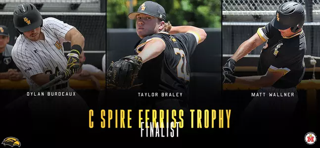 HATTIESBURG, Miss. - >Southern Miss senior first baseman Dylan Burdeaux (West Monroe, La.), junior third baseman/pitcher Taylor Braley (Hattiesburg, Miss.) and freshman outfielder/pitcher Matt Wallner (Forest Lake, Minn.) earned three of the five finalist spots for the 2017 C Spire Ferriss Trophy, which was announced Monday Morning.