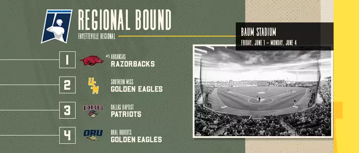 The Golden Eagles will be the No. 2 seed at the Fayetteville Regional on the campus of the University of Arkansas. The host Razorbacks (39-18) are the No. 1 seed and fifth-seed nationally, while Oral Roberts (38-18) is the No. 4 seed. Southern Miss will play No. 3 seed Dallas Baptist (40-19) at Baum Stadium.